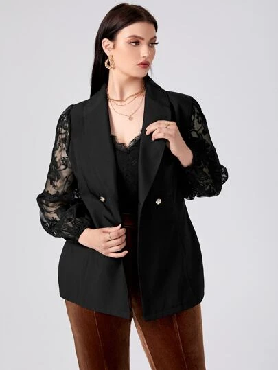 Plus Contrast Lace Sleeve Blazer - Black - View 1
