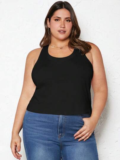 SHEIN BASICS Plus Size Solid Racerback Tank Top - Black - View 1