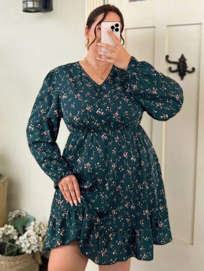Flirla Plus Ditsy Floral Print Flounce Sleeve Ruffle Hem Dress - Multicolor - View 1