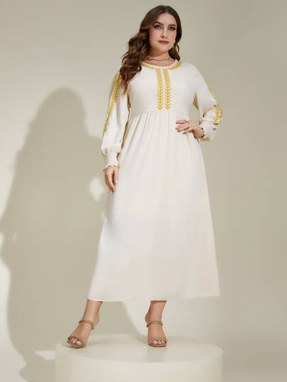 Al Najma Plus Embroidery Shirred Cuff Lantern Sleeve Dress - Apricot - View 1