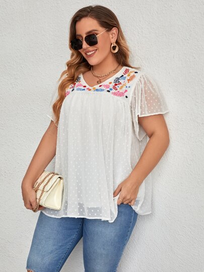 Mulvari Plus Floral Embroidery Swiss Dot Butterfly Sleeve Chiffon Blouse - White - View 1