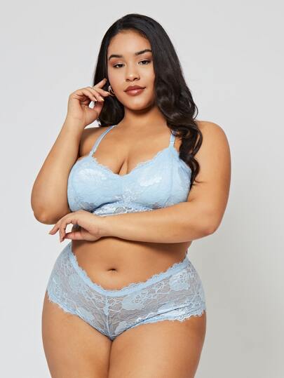 Plus Floral Lace Lingerie Set - Baby Blue - View 1
