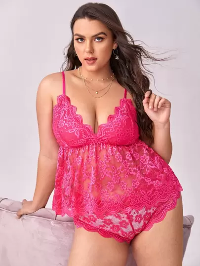 Plus Floral Lace Scallop Trim Lingerie Set - Hot Pink - View 1
