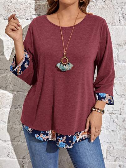 EMERY ROSE Plus Floral Print Asymmetrical Hem Tee - Burgundy - View 1