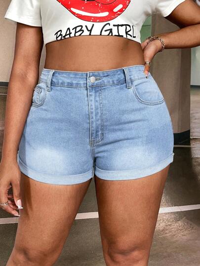 SHEIN SXY Plus Floral Print Denim Shorts - Light Wash - View 1