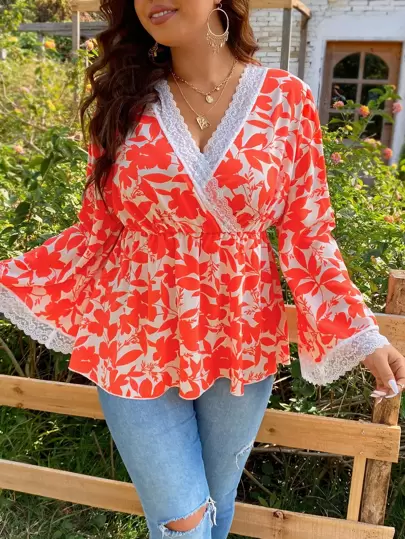 SHEIN Holidaya Plus Floral Print Guipure Lace Insert Blouse - Multicolor - View 1