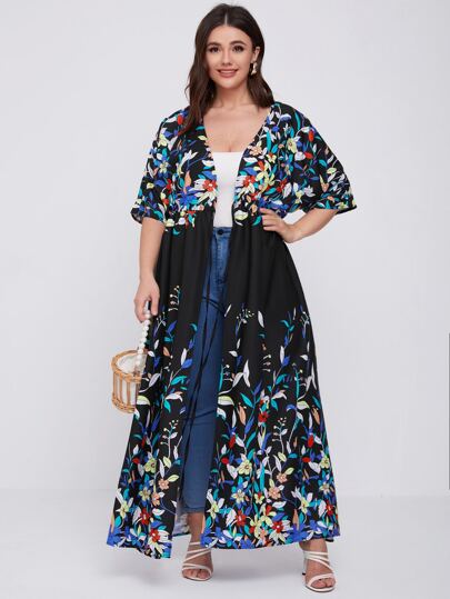 Plus Floral Print Knot Front Kimono - Multicolor - View 1