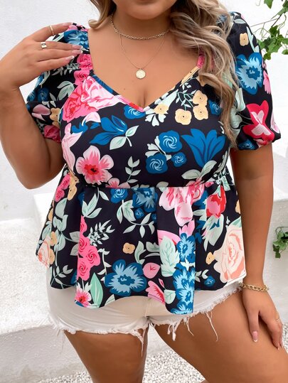 SHEIN LUNE Plus Floral Print Puff Sleeve Ruffle Hem Blouse - Multicolor - View 1