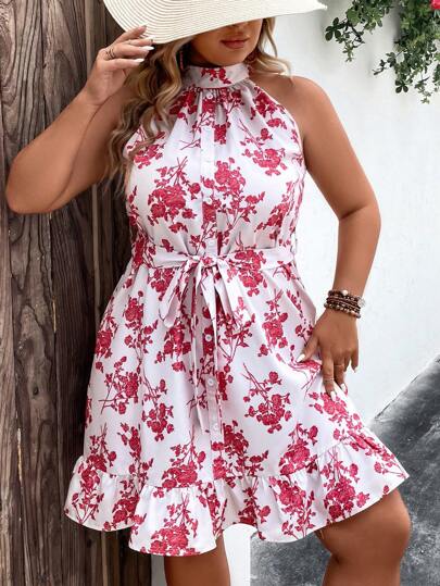 SHEIN LUNE Plus Floral Print Ruffle Hem Belted Dress - Red and White - View 1