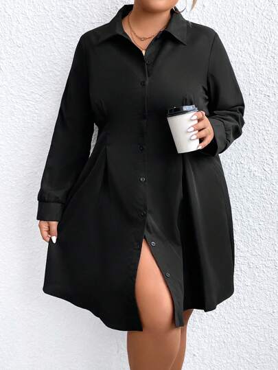 Celure Plus Fold Pleated Detail Shirt Dress - Black - View 1
