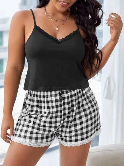 Plus Gingham Print Lace Trim PJ Set - Black and White - View 1