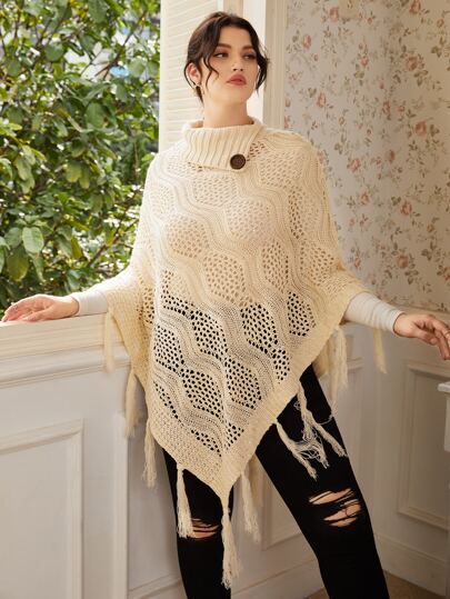 Plus Hanky Hem Fringe Trim Open Knit Poncho - Khaki - View 1