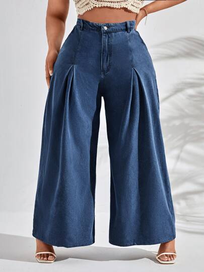 SHEIN SXY Plus High Waist Wide Leg Jeans - Medium Wash - View 1