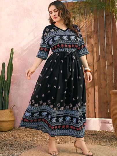 Plus Leaf & Elephant Print Belted Dress - Black - View 1