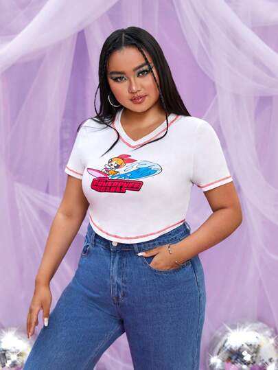 THE POWERPUFF GIRLS X SHEIN Plus Letter & Cartoon Graphic Contrast Binding Crop Tee - White - View 1