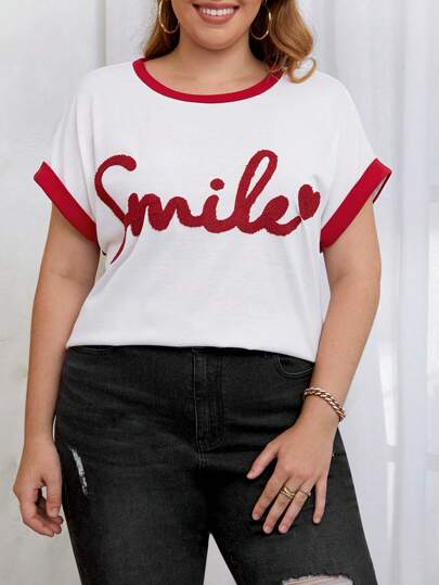 SHEIN Franclia Plus Letter Graphic Contrast Binding Batwing Sleeve Tee - Multicolor - View 1