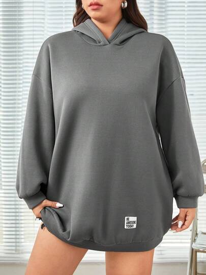 SHEIN EZwear Plus Letter Patched Drop Shoulder Hoodie - Grey - View 1