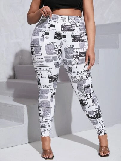 SHEIN SXY Plus Newspaper Print Leggings - Black and White - View 1