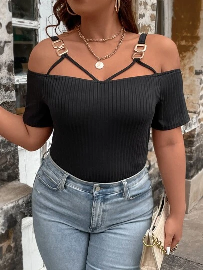 SHEIN Clasi Plus O-ring Detail Cold Shoulder Tee - Black - View 1