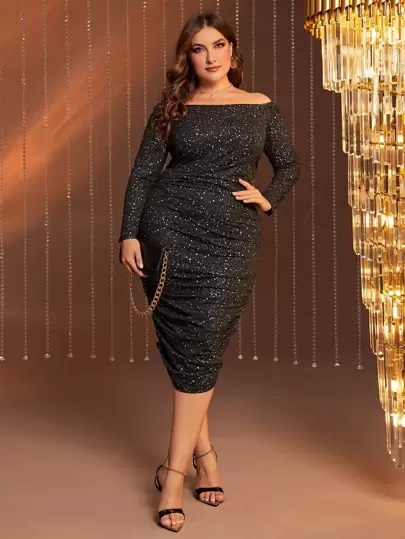 Modelyn Plus Off Shoulder Ruched Glitter Bodycon Dress - Black - View 1