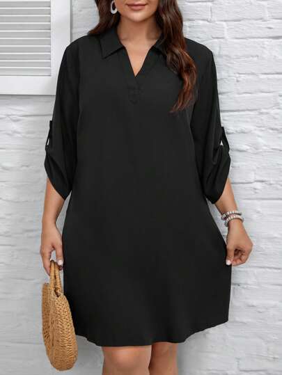 SHEIN LUNE Plus Size Navy Blue Hem Floral Print Long Sleeve Shirtdress Fall Women Clothes - Black - View 1