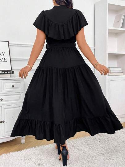 SHEIN Unity Plus Ruffle Trim Belted Dress Maxi Women Outfit - Black - View 1