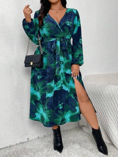 SHEIN Frenchy Plus Size Autumn Long Sleeve Dress With High Slit & Floral Print - Multicolor - View 1