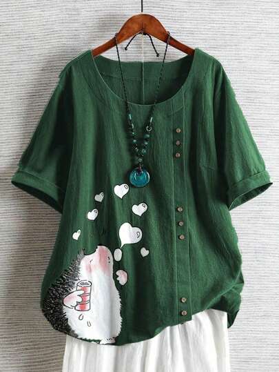 Plus Size Cartoon Print Round Neck Summer Casual Vacation Shirt - Dark Green - View 5