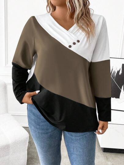 EMERY ROSE Plus Size Casual Contrast Color Button Decor Loose Long Sleeve T-Shirt, Autumn Graphic Tees, Women Tops For Spring - Multicolor - View 1