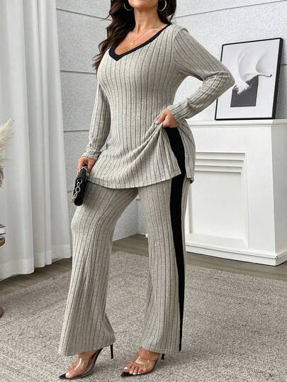 Flirla Plus Size Color Block 2pcs Set Long Sleeve Shirt And Pants - Apricot - View 1
