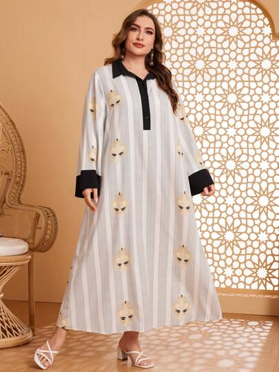 Al Najma Plus Size Color Block Turn-Down Collar And Cuff Long Sleeve Dress - White - View 1