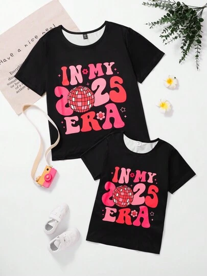 SHEIN Plus Size Crew Neck Short Sleeve Letter Print Casual Top, For Everyday Wear - Black - View 1