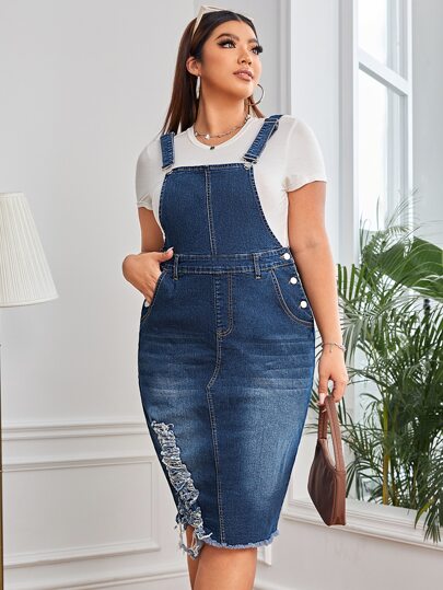 Plus Ripped Raw Hem Denim Pinafore Dress Without Tee - Medium Wash - View 1