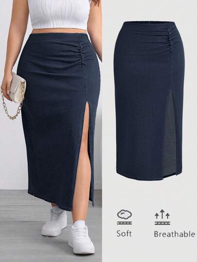 SHEIN Essnce Plus Size Denim Mini Skirt, Casual Ruched Side Slit Stretchy Blue - Dark Wash - View 1