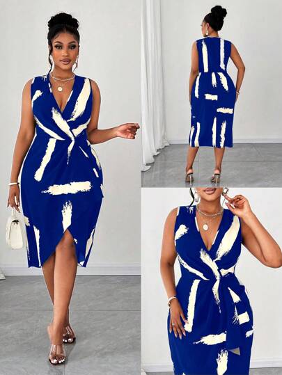 Maweii Plus Size Fashion Printed Sleeveless V-Neck Dress - Blue - View 1