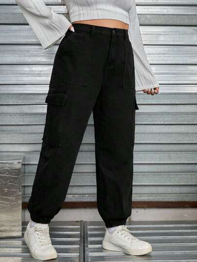 SHEIN EZwear Plus Flap Pocket Side Cargo Jeans - Black - View 1