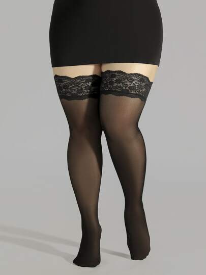 Plus Size Lace Trim Over The Knee Socks - Black - View 1