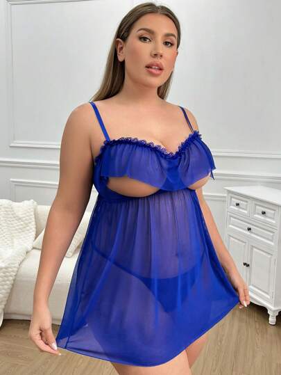 Plus Size Ladies Mesh Sexy Lingerie Dress + Thong - Royal Blue - View 1
