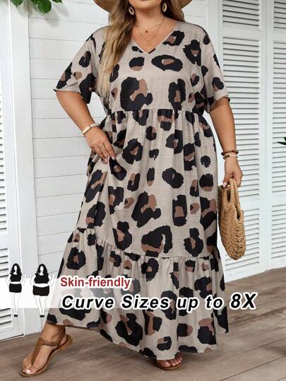 SHEIN CURVE+ Plus Size Leopard Print Maxi Casual Vacation Dress,Summer Dresses For Women,Maxi Dress - Grey - View 1