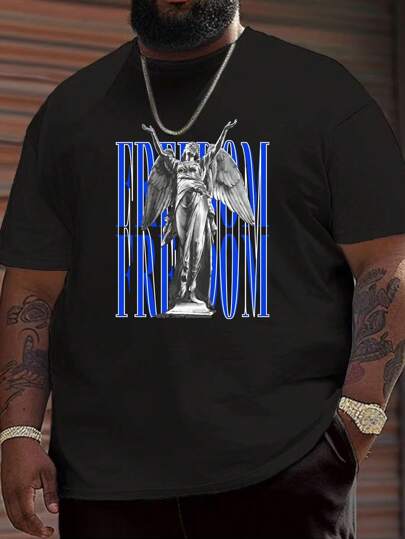 Plus Size Men's "Freedom" Letter Print Crew Neck Short Sleeve Casual T-Shirt - Black - View 1