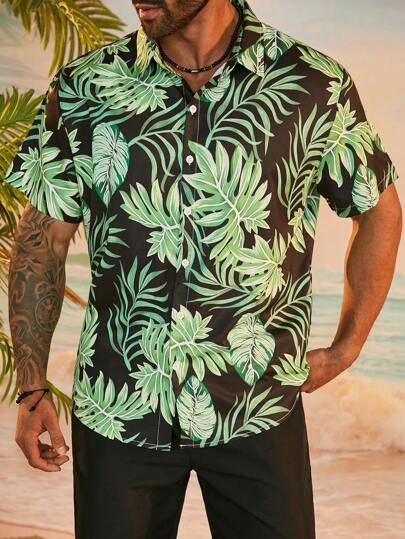 ResortEase Plus Size Random Tropical Plant Printed Shirt And Shorts Two-Piece Set - Black - View 1