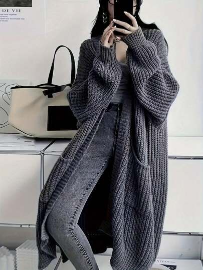 Plus Size Solid Color Cardigan Sweater, Minimalist Fashion Casual Everyday Wear, For Winter - Dark Grey - View 1
