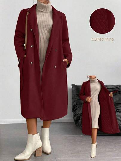 Juhart Plus Size Solid Color Double-Breasted Long Sleeve Fashionable & Versatile Overcoat - Red - View 1