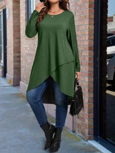 Plus Size Solid Color Long Asymmetrical Hem Round Neck Long Sleeve T-Shirt - Green - View 1