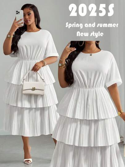 Slaydiva Plus Size Solid Color Long Sleeve Dress, Fashionable For Summer,Flowy Dress - White - View 1