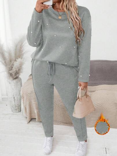 Plus Size Solid Color Pearl Decorated Long Sleeve T-Shirt And Pants Set - Grey - View 1