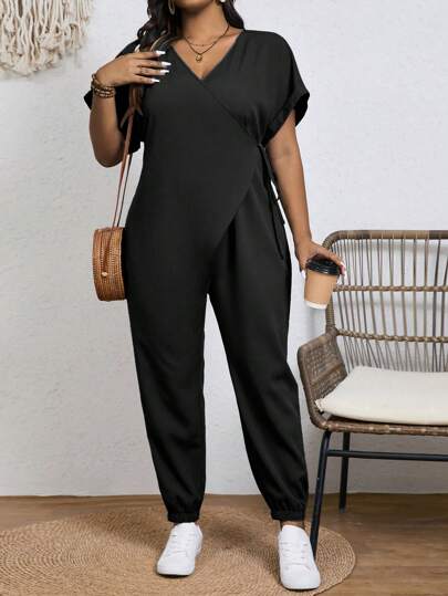 SHEIN LUNE Plus Size Solid Color V-Neck Short Sleeve Casual Tie Waist Jumpsuit - Black - View 1