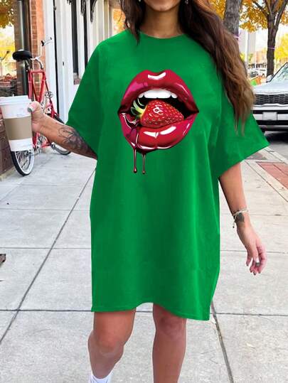 Flirla Plus Size Summer Round Neck Lips Printed Short Sleeve T-Shirt Dress - Green - View 1