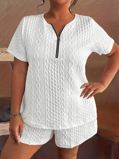 Calvaya Plus Size Textured Jacquard Zip-Up Top & Shorts 2 Pieces Set, Casual And Comfortable - White - View 1