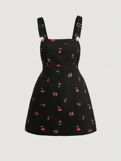 SHEIN MOD Plus Size Women'S Cherry Printed Front Patch Pockets Side Zip Summer Going Out Overall Dress - Black - View 1